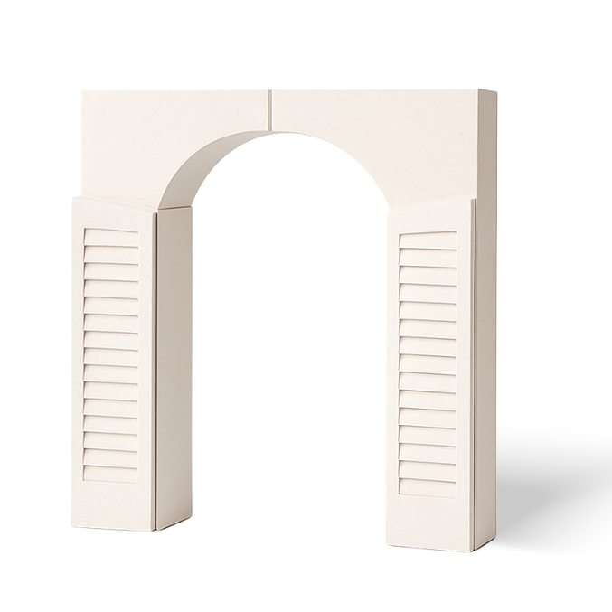 Modular rectangular backdrop featuring a built in arch design and windows. Perfect for photo backdrops, stages, or focal décor areas. Its modular structure allows it to be combined with other pieces for customized layouts.
